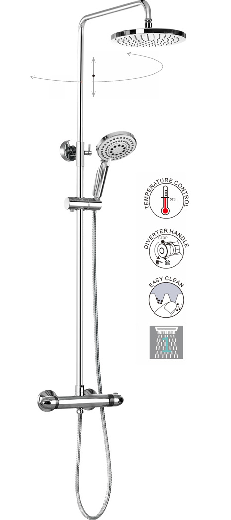 THERMOSTATIC CONTROL : CONSTANTLY REGULATED TEMPERATURE GIVES THE USER MORE PRECISE CONTROL AND SAFER SHOWERING AUTOMATIC SHUTDOWN: COLD WATER SUPPLIES FAIL EXTENDABLE COLUMN SET BRASS/ABS CLASSICAL SHOWER HEAD WITH RUB CLEAN SYSTEM 5 PATTERNS ECO-STOP HANDSET WITH RUB CLEAN SYSTEM |
